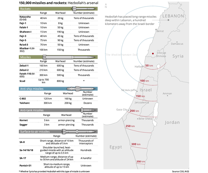 Según las últimas estimaciones públicas, Hezbolá tiene alrededor de 150.000 cohetes y misiles, la mayoría con un alcance de unas pocas docenas de kilómetros. Sin embargo, varios informes dicen que un número considerable puede alcanzar objetivos ubicados a cientos de kilómetros del Líbano. Hezbolá es el actor no estatal más fuertemente armado del mundo, concluyeron investigadores del Centro de Estudios Estratégicos e Internacionales de Washington en un extenso informe de 2018 sobre el arsenal letal estacionado justo al norte de Israel. El grupo posee una reserva grande y diversa de artillería de cohetes «tonta» junto con misiles balísticos, antiaéreos, antitanques y antibuque, según el informe.